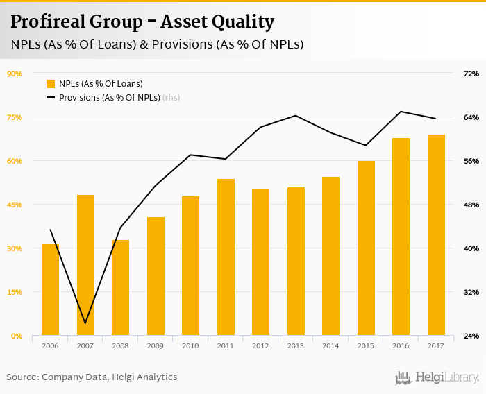 Profireal Group's non-performing loans reached 69.0% of total loans at the end of 2017, up from 67.7% compared to the previous year. Historically, the NPL ratio hit an all time high of 69.0% in 2017 and an all time low of 31.4% in 2006.