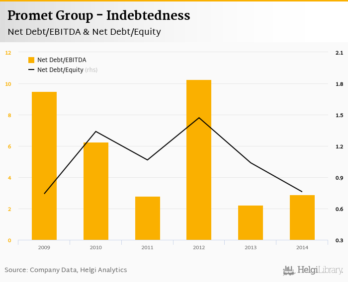 Promet Group's net debt stood at CZK 936 mil and accounted for 0.760 of equity at the end of 2014. The ratio is down 0.279 pp compared to the previous year.
