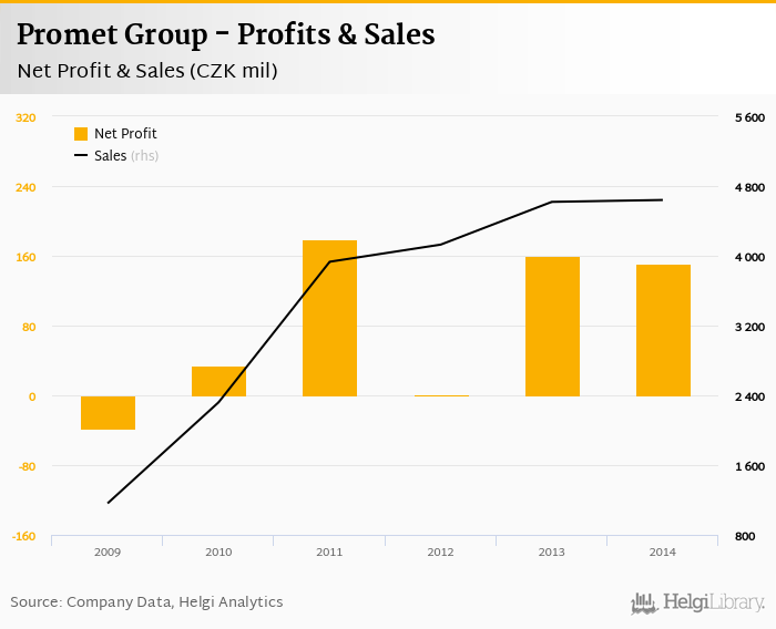 Promet Group made a net profit of CZK 151 mil in 2014, down 5.95% compared to the previous year. Total sales reached CZK 4,640 mil, which is up 0.474% when compared to the previous year.