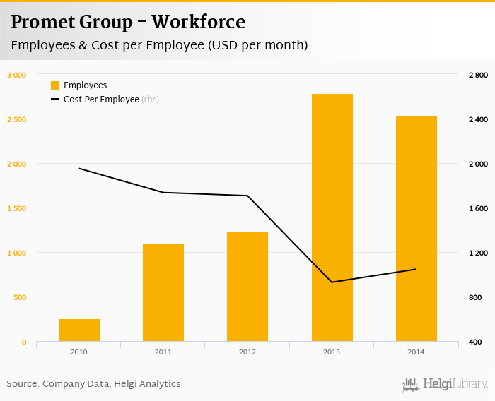Promet Group employed 2,536 employees in 2014, down 9.01% compared to the previous year. Historically, between 2010 and 2014, the firm's workforce hit a high of 2,787 employees in 2013 and a low of 257 employees in 2010.