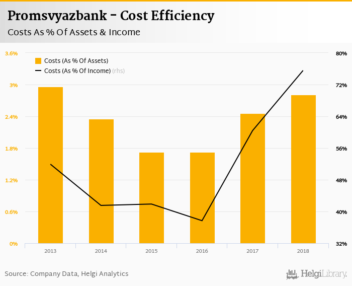 Comparing Promsvyazbank with its closest peers, Alfa Bank operated in 2018 with a cost to income ratio of 39.2% in 2018,.