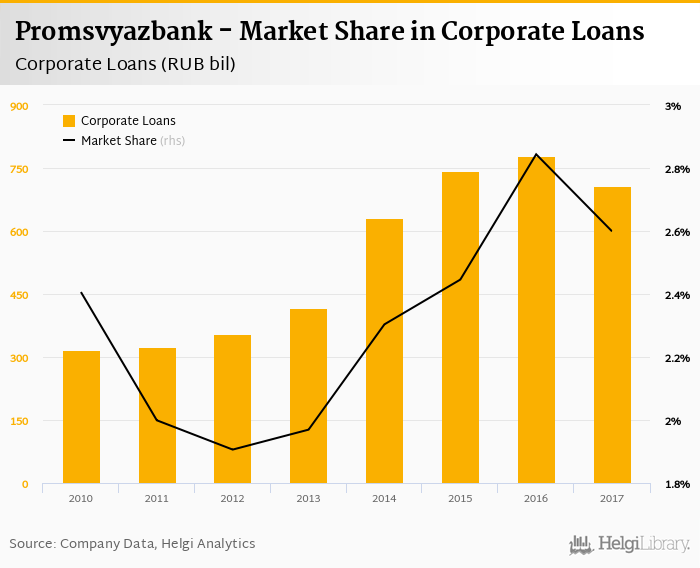 Promsvyazbank accounted for 2.60% of all corporate loans issued in Russia at the end of 2017. Historically, the bank’s market share in corporate loans reached an all time high of 2.84% in 2016 and an all time low of 1.91% in 2012.