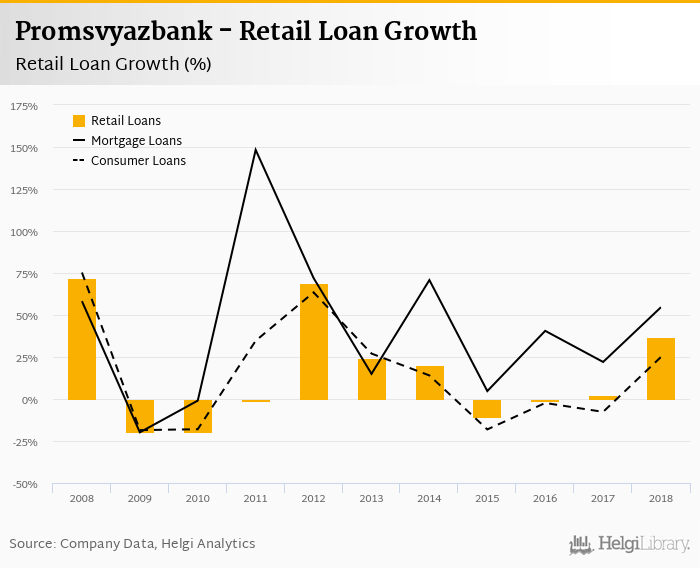 Promsvyazbank's retail loans reached RUB 101 bil at the end of 2018, up 37.0% compared to the previous year. In the last decade, the average annual loan growth amounted to 7.17%.