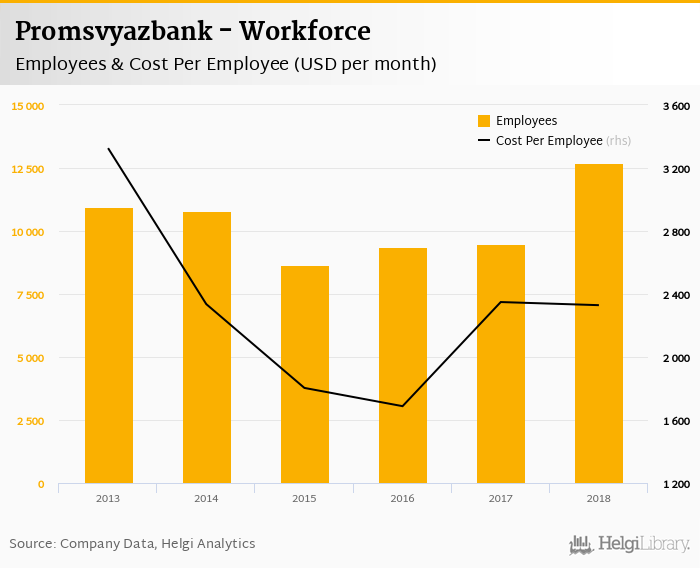 Promsvyazbank employed 12,700 persons in 2018, up 33.7% when compared to the previous year. Historically, the bank's workforce hit an all time high of 12,700 persons in 2018 and an all time low of 8,649 in 2015.