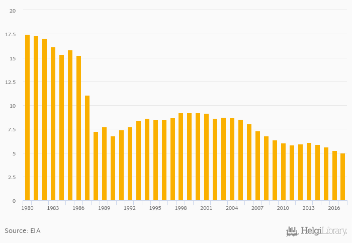 Proved reserves of crude oil fell 5.71% to 4.96 bil barrels in the European Union in 2017, according to EIA.