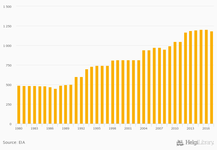 Proved reserves of natural gas fell 1.53% to 1,183 trillion cb ft in Iran in 2017, according to EIA.