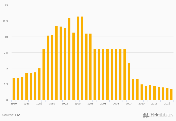 Proved reserves of natural gas fell 8.54% to 1.74 trillion cb ft in Italy in 2017, according to EIA.