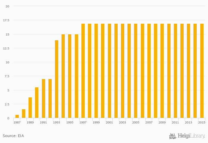Proved reserves of natural gas rose 0% to 16.9 trillion cb ft in Yemen in 2015, according to EIA.