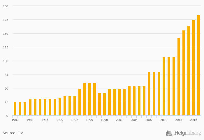 Proved reserves of natural gas rose 5.03% to 183 trillion cb ft in China in 2017, according to EIA.
