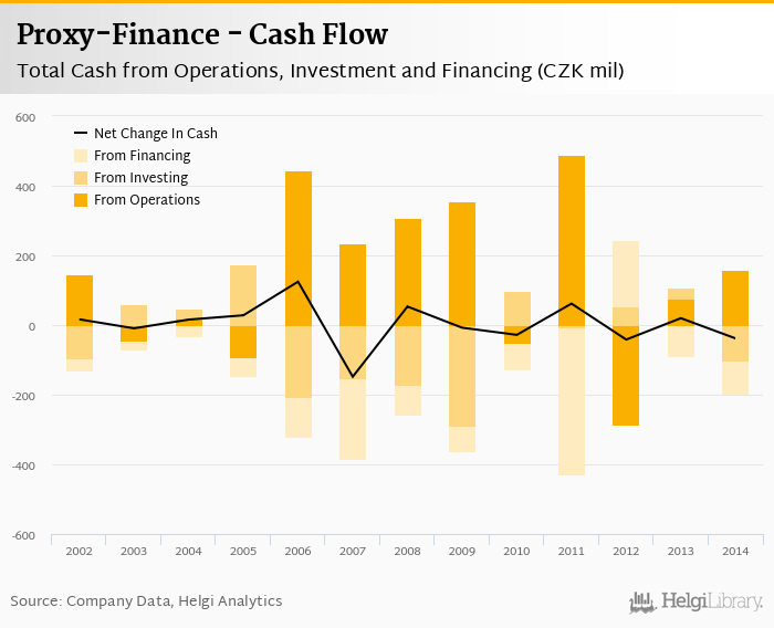 Proxy-Finance's operating cash flow stood at CZK 160 mil in 2014, up 107% when compared to the previous year. Historically, between 2002 - 2014, the firm’s operating cash flow reached a high of CZK 489 mil in 2011 and a low of CZK -286 mil in 2012.