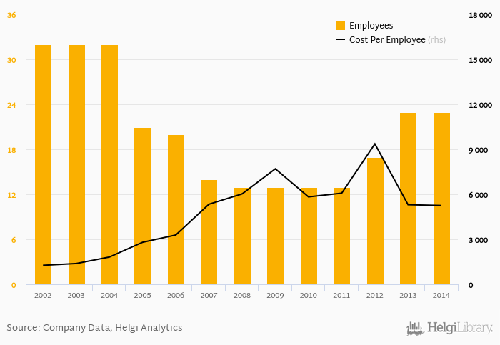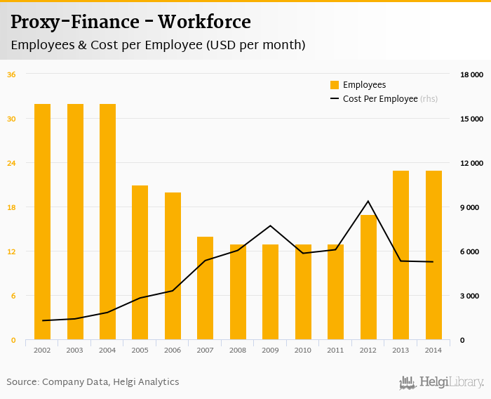 Proxy-Finance employed 23.0 employees in 2014, up 0% compared to the previous year. Historically, between 2002 and 2014, the firm's workforce hit a high of 32.0 employees in 2004 and a low of 13.0 employees in 2008.