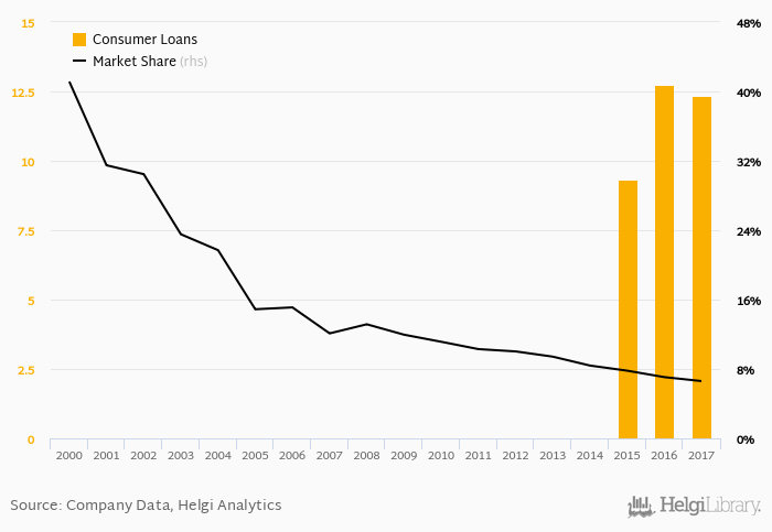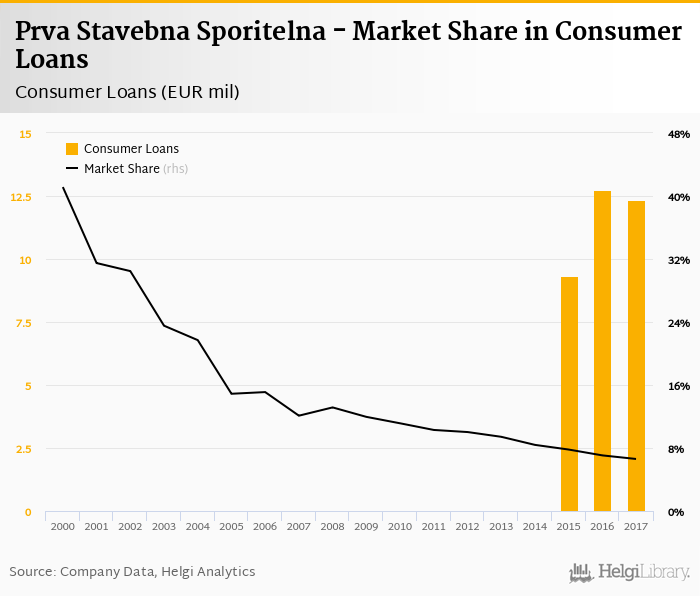 Prva Stavebna Sporitelna accounted for 6.61% of all consumer loans issued in Slovakia at the end of 2017. Historically, the bank’s market share in consumer loans reached an all time high of 41.1% in 2000 and an all time low of 6.61% in 2017.