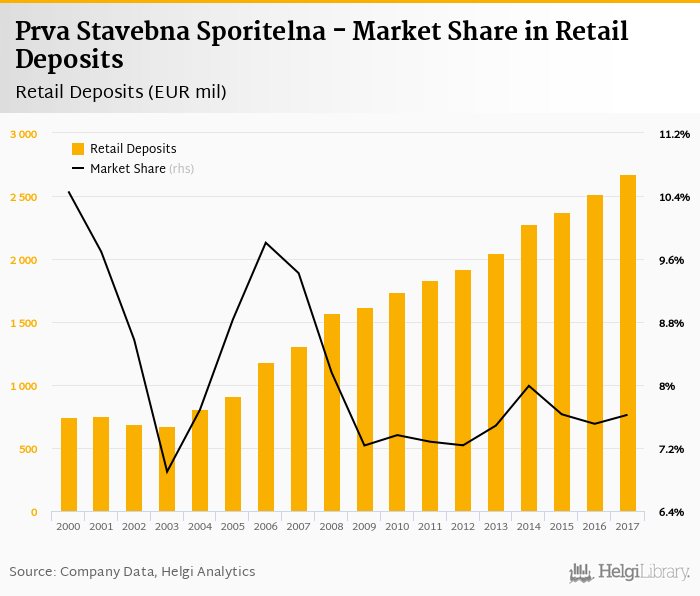 Prva Stavebna Sporitelna accounted for 7.62% of all retail deposits taken by banks in Slovakia at the end of 2017. Historically, the bank’s market share in retail deposits reached an all time high of 10.5% in 2000 and an all time low of 6.90% in 2003.