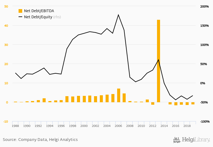Historically, the firm’s net debt to equity reached a high of 177% in 2006 and a low of -44.4% in 2016 between 1988 and 2019. The average for the last five years was -37.4%.