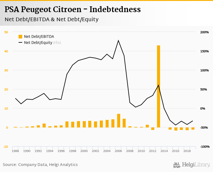 PSA Peugeot Citroen's net debt stood at EUR -7,263 mil and accounted for -33.3% of equity at the end of 2019. The ratio is up 9.69 pp compared to the previous year.