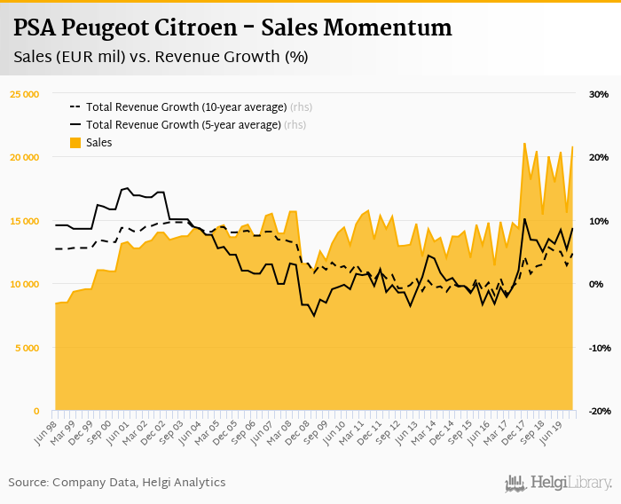 PSA Peugeot Citroen generated sales of EUR 20,812 mil in 4Q2019, up 4.04% compared to the previous year. Historically, between 2Q1988 and 4Q2019, the company’s sales reached a high of EUR 21,057 mil in 4Q2017 and a low of EUR 4,950 mil in 2Q1988.