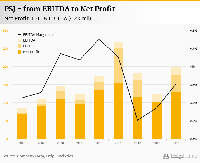 PSJ made a net profit of CZK 131 mil with revenues of CZK 5,498 mil in 2014, up by 28.9% and up by 37.9%, respectively, compared to the previous year. This translates into a net margin of 2.39%.