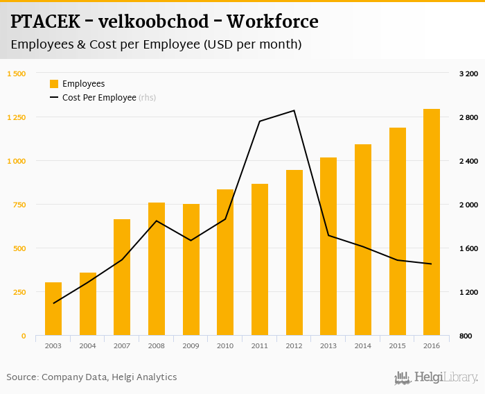 PTACEK - velkoobchod employed 1,298 employees in 2016, up 8.98% compared to the previous year. Historically, between 2003 and 2016, the firm's workforce hit a high of 1,298 employees in 2016 and a low of 307 employees in 2003.