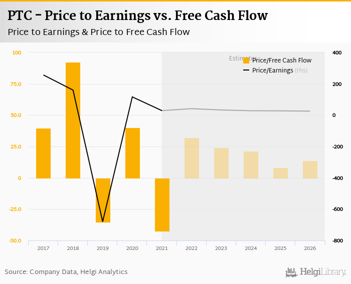 Regarding cash generated defined by the sum of net profit and depreciation, the stock traded at 27.3x at the end of 2021. When investments are excluded to get free cash flow, PTC traded at -42.6x.