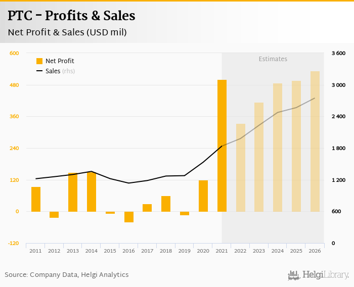 PTC made a net profit of USD 499 mil in 2021, up 321% compared to the previous year. Total sales reached USD 1,836 mil, which is up 19.9% when compared to the previous year.