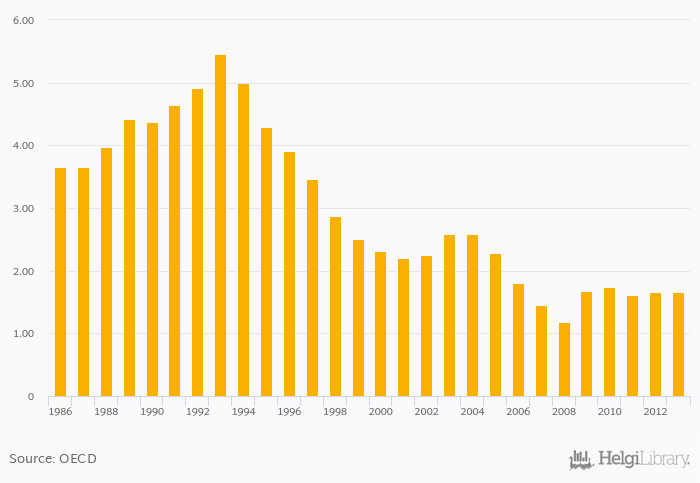 Historically, Public Expenditure on Passive Labour Market Policies (As % of GDP) in Denmark reached an all time high of 5.45% in 1993 and an all time low of 1.18% in 2008.