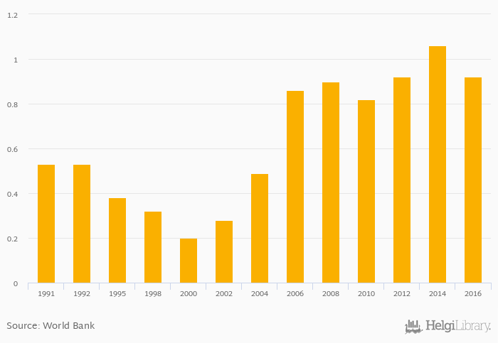Pump prices for gasoline fuel rose 0% to USD 0.920 per litre in Ghana in 2016, according to World Bank.