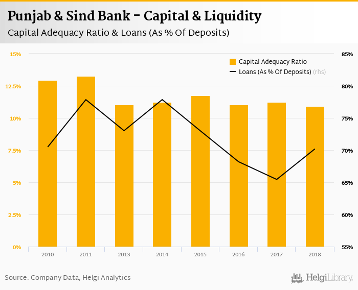 Punjab & Sind Bank's capital adequacy ratio reached 10.9% at the end of 2018, down from 11.3% compared to the previous year. Historically, the bank’s capital ratio hit an all time high of 13.3% in 2011 and an all time low of 10.9% in 2018.
