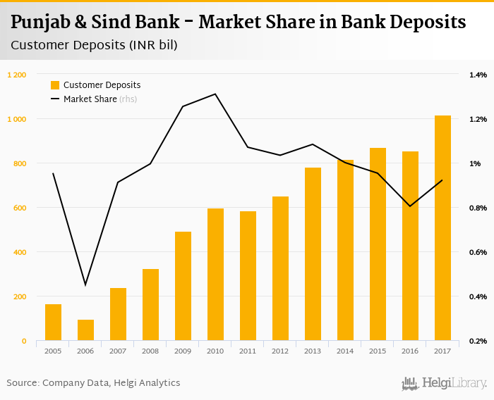 Punjab & Sind Bank accounted for 0.922% of all customer deposits taken by banks in India at the end of 2017. Historically, the bank’s market share in customer deposits reached an all time high of 1.31% in 2010 and an all time low of 0.450% in 2006.