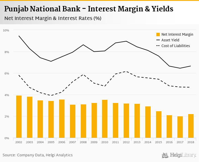 Punjab National Bank's net interest margin amounted to 2.23% in 2018, up from 2.01% compared to the previous year.