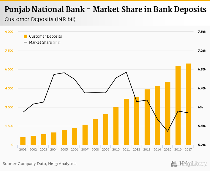 Punjab National Bank accounted for 5.88% of all customer deposits taken by banks in India at the end of 2017. Historically, the bank’s market share in customer deposits reached an all time high of 6.74% in 2011 and an all time low of 5.49% in 2015.