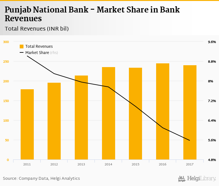 Punjab National Bank generated total banking revenues of INR 241 bil in 2017, down 1.73% compared to the previous year.