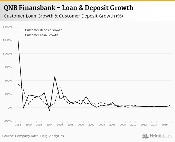 QNB Finansbank's customer loan growth reached 31.8% in 2017, up from 9.92% compared to the previous year. Historically, the bank’s loans growth reached an all time high of 425% in 1988 and an all time low of -1.85% in 2009. In the last decade, the average annual loan growth amounted to 19.3%.