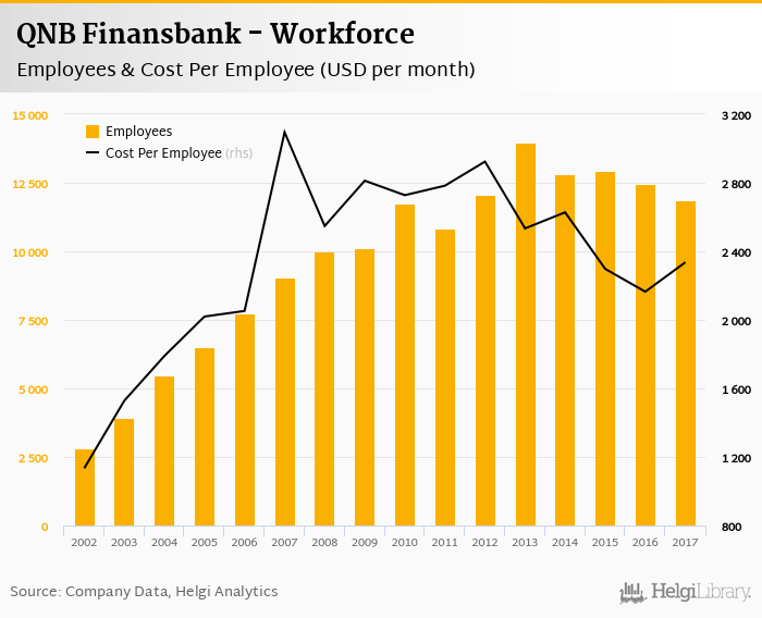 QNB Finansbank employed 11,854 persons in 2017, down 4.79% when compared to the previous year. Historically, the bank's workforce hit an all time high of 13,967 persons in 2013 and an all time low of 2,811 in 2002.