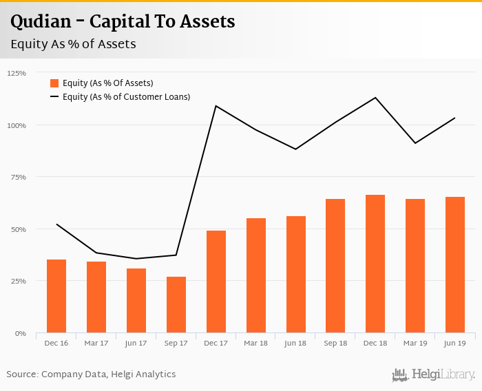 Qudian's Equity reached 40.8% of total assets in the 2Q2019, up from 16.2% for the previous year. As a share of net customer loans, the ratio amounted to 100% at the end of the second quarter of 2019.