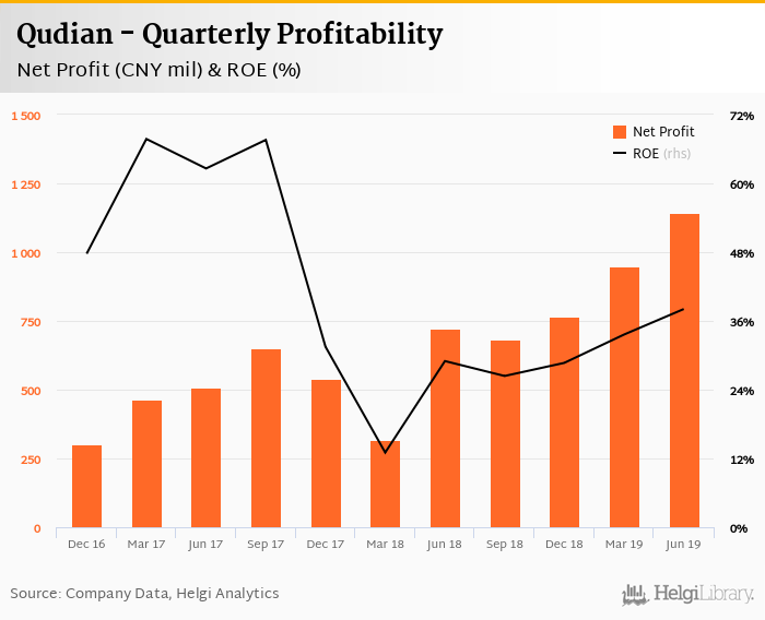 Qudian made a net profit of CNY 1,143 mil in the second quarter of 2019, up 57.9% when compared to the same period of last year. This implies a return on equity of 38.1%.