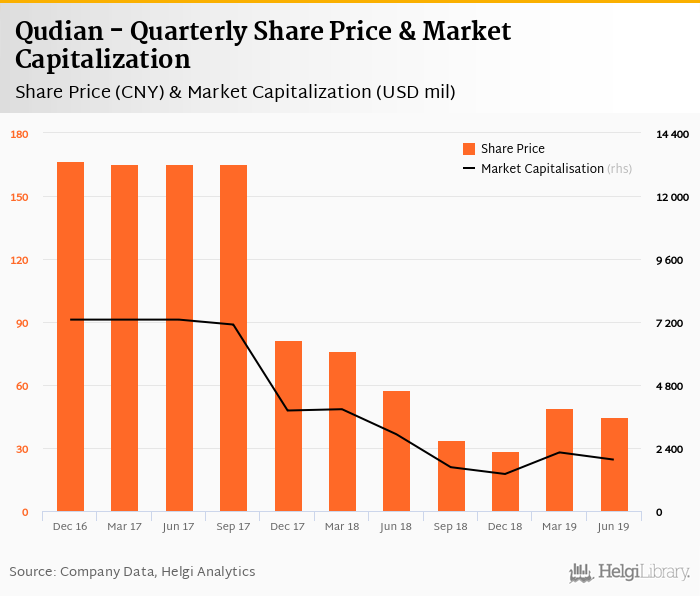 Qudian stock traded at CNY 44.6 per share at the end of second quarter of 2019 implying a market capitalization of USD 1,957 mil.