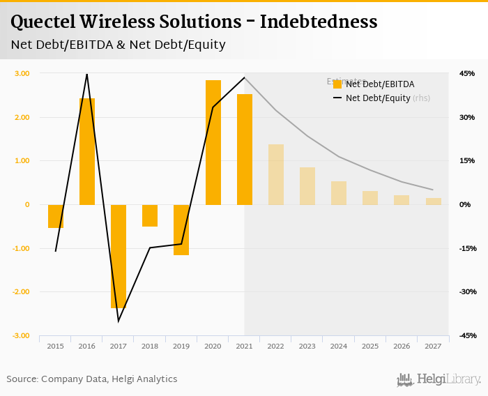 Quectel Wireless Solutions's net debt stood at CNY 1,395 mil and accounted for 43.5% of equity at the end of 2021. The ratio is up 10.2 pp compared to the previous year.