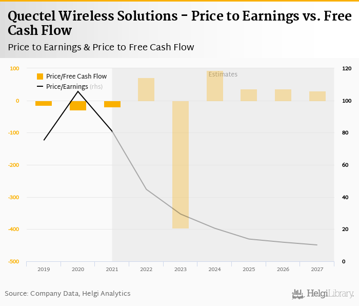 Regarding cash generated defined by the sum of net profit and depreciation, the stock traded at 55.3x at the end of 2021. When investments are excluded to get free cash flow, Quectel Wireless Solutions traded at -19.8x.