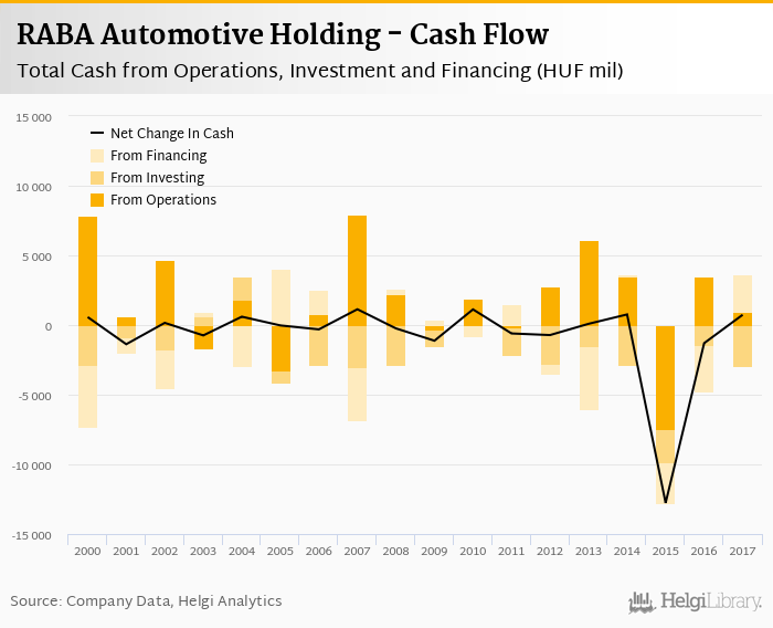 RABA Automotive Holding's operating cash flow stood at HUF 963 mil in 2017, down 72.2% when compared to the previous year. Historically, between 2000 - 2017, the firm’s operating cash flow reached a high of HUF 7,943 mil in 2007 and a low of HUF -7,471 mil in 2015.