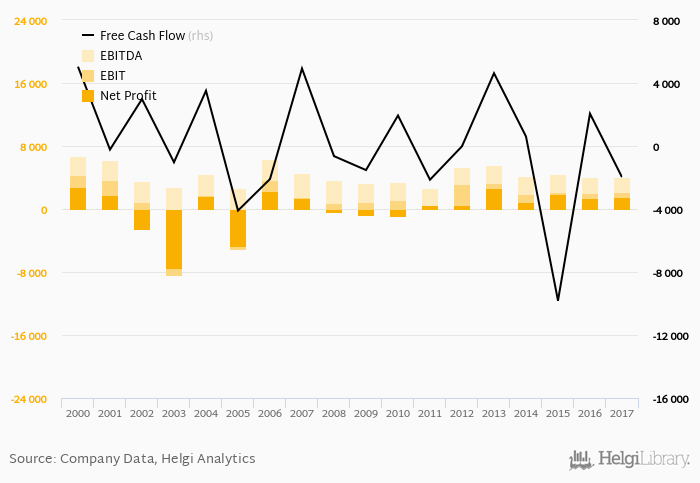 The company generated cash, defined by a sum of net profit and depreciation, of HUF 3,520 mil or 8.03% of sales. When investments are excluded, free cash flow reached HUF -1,978 mil, or -4.51% of sales in 2017.