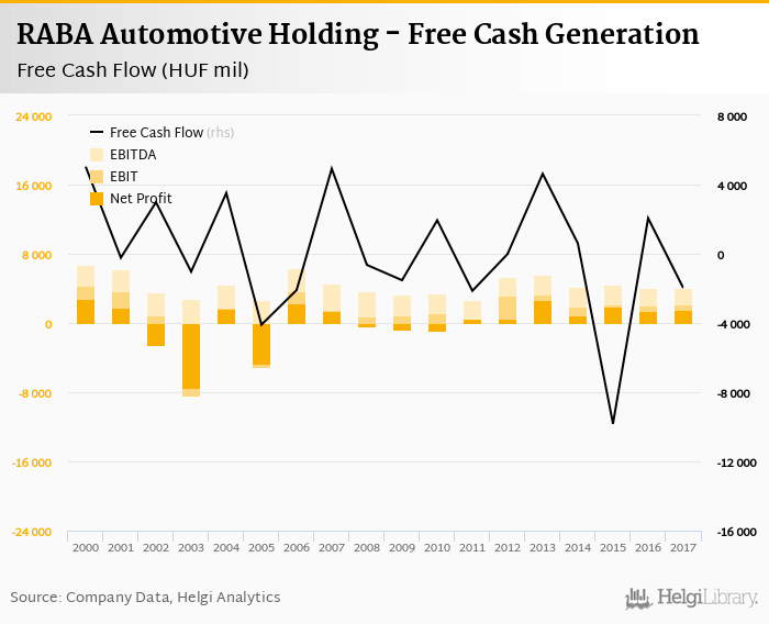 RABA Automotive Holding made a net profit of HUF 1,569 mil with revenues of HUF 43,842 mil in 2017, up by 13.9% and up by 2.84%, respectively, compared to the previous year. This translates into a net margin of 3.58%.
