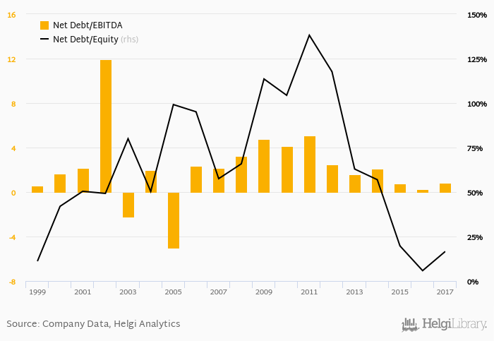 Historically, the firm’s net debt to equity reached a high of 138% in 2011 and a low of 5.81% in 2016 between 1999 and 2017. The average for the last five years was 32.4%.
