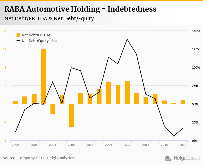 RABA Automotive Holding's net debt stood at HUF 3,316 mil and accounted for 16.6% of equity at the end of 2017. The ratio is up 10.8 pp compared to the previous year.