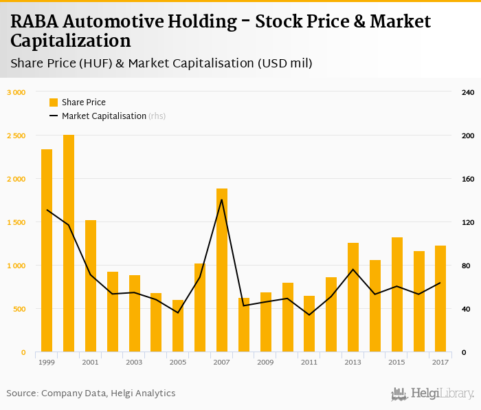 RABA Automotive Holding stock traded at HUF 1,233 per share at the end 2017 implying a market capitalization of USD 63.6 mil.