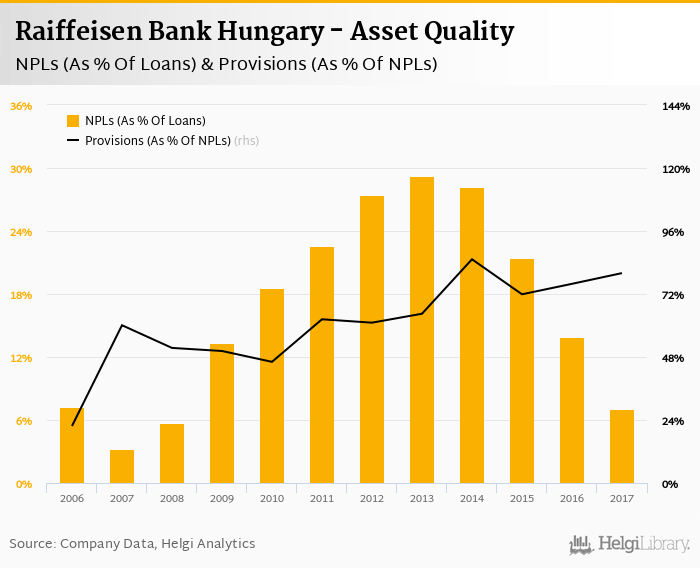 Raiffeisen Bank Hungary's non-performing loans reached 7.02% of total loans at the end of 2017, down from 13.9% compared to the previous year. Historically, the NPL ratio hit an all time high of 29.3% in 2013 and an all time low of 3.24% in 2007.