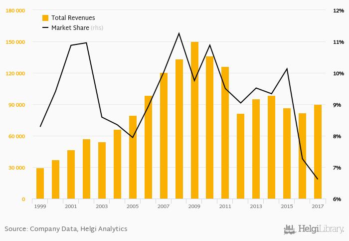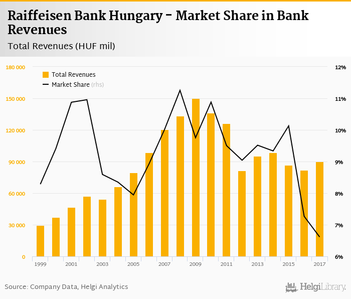 As a result, Raiffeisen Bank Hungary accounted for 6.61% of all bank revenues generated by banks in Hungary in 2017. Historically, the bank’s market share in total revenues reached an all time high of 11.3% in 2008 and an all time low of 6.61% in 2017.