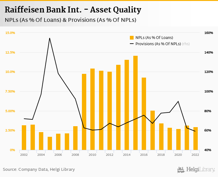 Comparing Raiffeisen Bank Int. with its closest peers, PKO BP operated at the end of 2022 with NPL ratio of 3.69% and provision coverage of 110% and Pekao with 5.94% and 100% respectively.