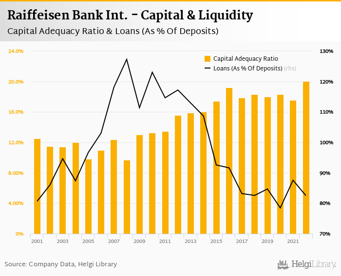 Comparing Raiffeisen Bank Int. with its closest peers, PKO BP ended the year 2022 with a capital adequacy ratio at 17.8% and loans to deposits of 68.2% and Pekao with 17.4% and 75.3% respectively.