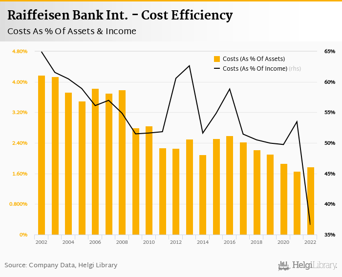 Comparing Raiffeisen Bank Int. with its closest peers, PKO BP operated in 2022 with a cost to income ratio of 52.8% in 2022, and Pekao reached 54.5%.