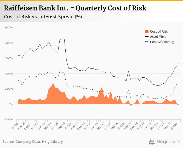 Raiffeisen Bank Int.'s Cost of Risk (loan loss provisions as % of total assets) amounted to -0.015% in the third quarter of 2023, up from -0.081% when compared to the previous quarter.